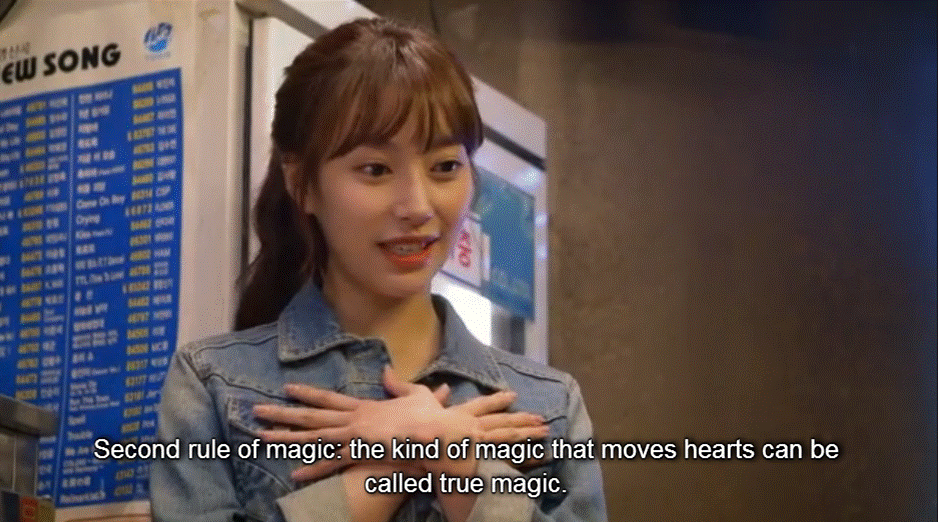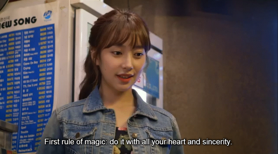 She begins to teach him the ‘basics’. While showing him what to do with the piece of tissue paper (tucking it into their hands), she says that they need to do a magical chant: ‘Magic princess SeRa has arrived’~ JiDan asks if he really needs to sing that, to which SeRa responds that yes he does, as it is her magic trick.