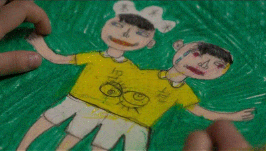 The two children are drawing and we find out Min lied. The rather creepy drawings are his and that the symbol is his signature. (So Min is the psychopath?)