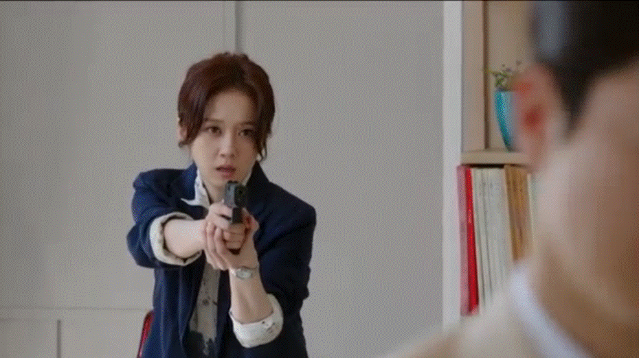 JiAn charges into the apartment, gun raised at the man who is facing away from her.
