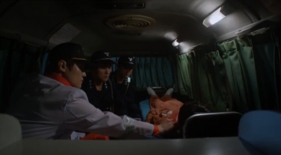 JoonYoung is then stretchered into the back of an ambulance, the two guards hesitantly accompanying him.