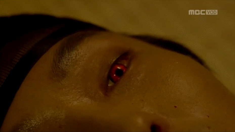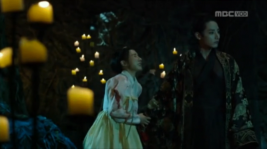 Gwi holds a knife to her throat as he leads her down to him from his throne. He asks MyungHee how it feels to see that her lover has been turned into a vampire. Gwi slices her arm and as SungYeol rushes forward to help her, Gwi stabs him through the chest.