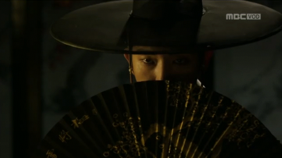 YangSun enters the room and it looks like our noted Scholar is SungYeol, using a different name. He hides behind a fan which closes with a flourish when a screen is lowered down between himself and YangSun.