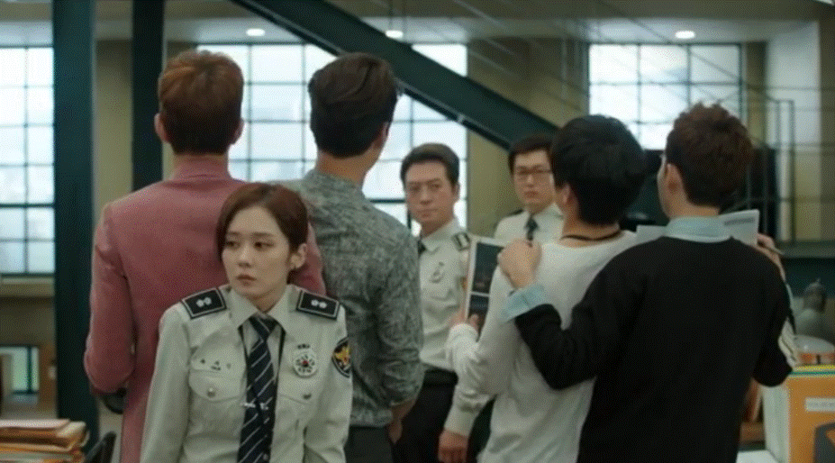 However, when she goes to leave, she sees the DC and hides. Her team immediately stand up and hide her (this team is too cute~). The DC pauses in front of them and EunHyuk salutes and says ‘allegiance’ (as if that makes their behaviour less suspicious haha). The team even move with the DC, so that he won’t be able to see her.