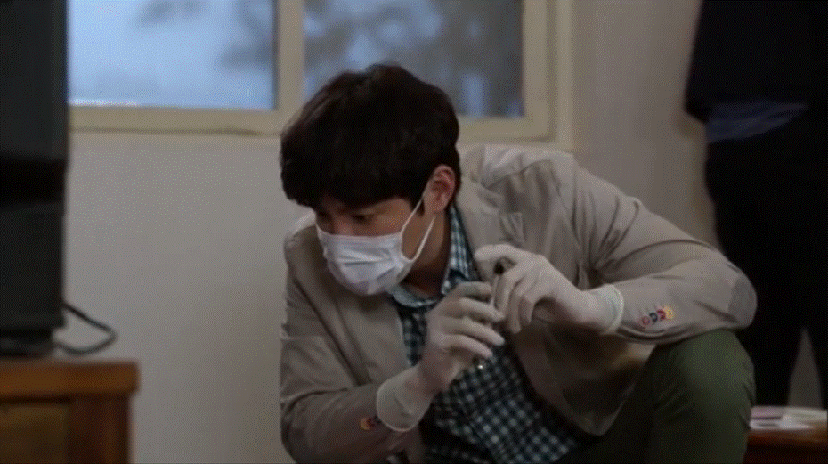 JoonHo tells Hyun, that he might have a handkerchief in his pocket, put instead only finds medical supplies (who has a magnifying glass on them when they are hosing grass?). He looks at the things in his