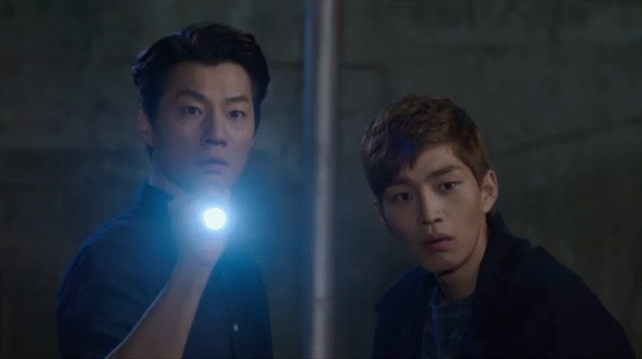 Hyun hears the approaching footsteps of EunHyuk and MyeongWoo and hurriedly shoves JiAn into the closet, keeping his hand over her mouth. EunHyuk creeps into the apartment, his trusty torch at the ready (I love how MyeongWoo teases him by shouting