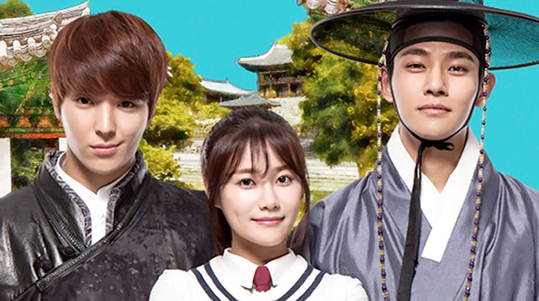 Everyone is in cosplay as they gesture to two figures facing away from them. ShiHyun turns round and smiles down at YooNa, who is dressed in her school uniform. When MongRyong turns round, the pair begin to walk down the steps towards her, her uniform having been magically replaced with a hanbok.