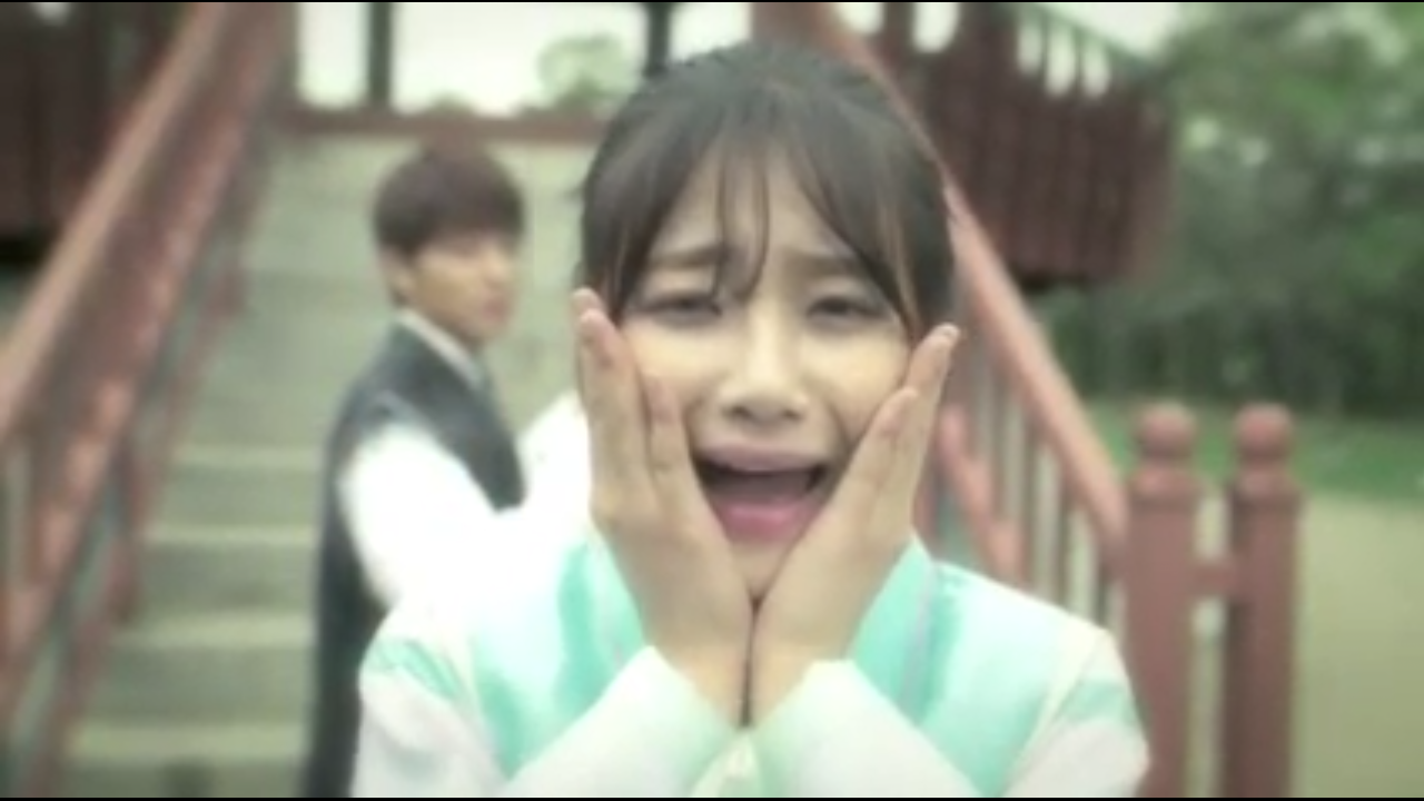 Everyone is in cosplay as they gesture to two figures facing away from them. ShiHyun turns round and smiles down at YooNa, who is dressed in her school uniform. When MongRyong turns round, the pair begin to walk down the steps towards her, her uniform having been magically replaced with a hanbok.