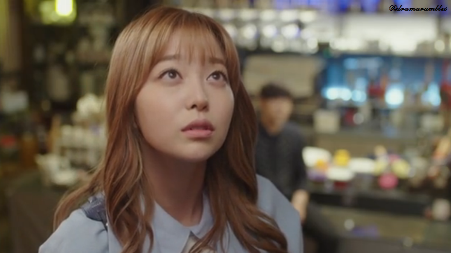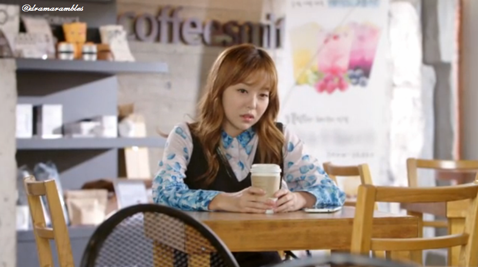 Using the card she goes down to the coffee shop. SongAh thinks he must be being so nice because she is the youngest on the team and happily drinks her coffee. However, her happy mood is cut short by an incoming call. GookDae wants to know where she is and SongAh grumpily tells him she is on her way.