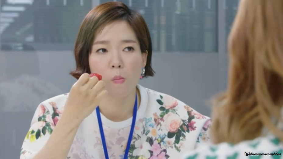 The meeting is under way and Kevin is enthusiastic about the strawberries. He says they taste especially good, but that may have something to do with who washed them. Kevin and SongAh then share several glances. Kevin’s looks rather smitten, while SongAh looks a little confused.