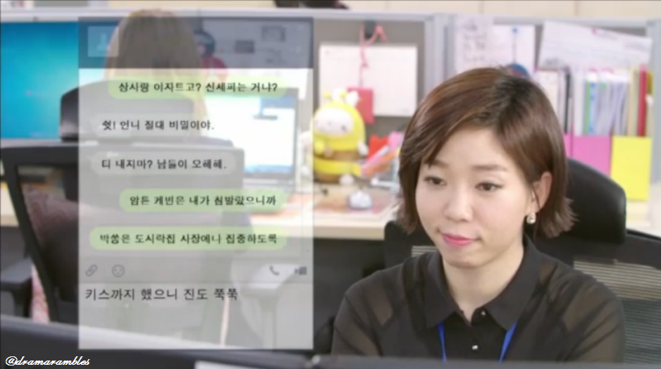 At their desks, DoekHee and SongAh chat through messaging. SongAh settles DoekHee, strongly saying that she and Kevin are only friends. DoekHee is happy, saying she is the one who has a claim on him (ha!), but she is still jealous that SongAh can speak informally with a senior staff member. DoekHee tells SongAh to focus on GookDae, especially as they have already kissed.