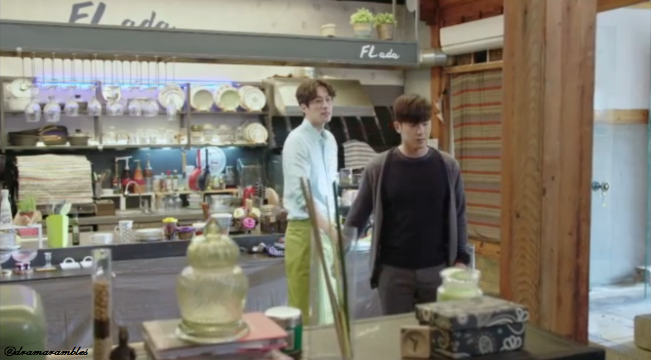 GookDae comes in with ingredients and tells BiRyong they should start prepping. BiRyong slowly walks over and tells him that SongAh came by and said some strange things. GookDae starts to leave, but BiRyong grabs his arm. GookDae tells him it’s true, which causes BiRyong to ask if she knows about his situation. He realises from GookDae’s expression that ‘no, she doesn’t’. GookDae starts to prep while BiRyong looks a little disappointed in him.