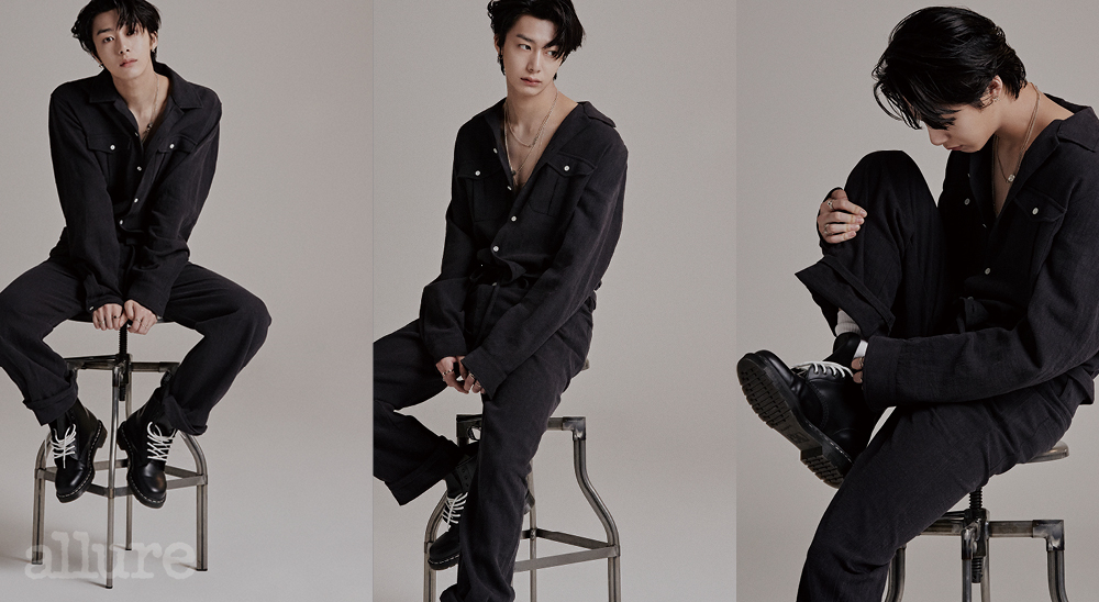 블랙 점프슈트는 노앙. 가죽 소재 워커 부츠는 닥터마틴. 실버 이어링과 오른손에 착용한 실버 링은 프리카. 왼쪽에 착용한 실버 이어링과 네크리스는 모두 락킹에이지. 왼손 중지에 착용한 실버 링은 베루툼.