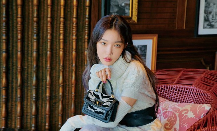 The pose is a bit awkward, but it does highlight the clothes Chungha is wearing. The black and white jacket with an oversized collar is from dewedewe. Underneath is a short check dress from Zara. The white ankle boots and white clasp bag round off the outfit and are from Charles & Keith.