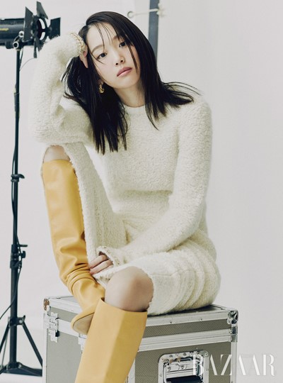 This fluffy dress from Ports 1961 looks so soft! I’m not so find of long boots, but the yellow is such a nice pop of colour in a rather muted photo. Jin Ki Joo is also wearing earrings from Doigte.