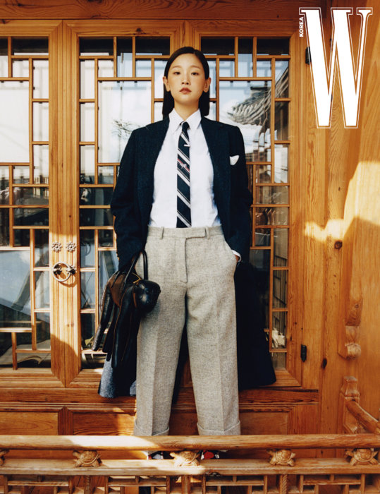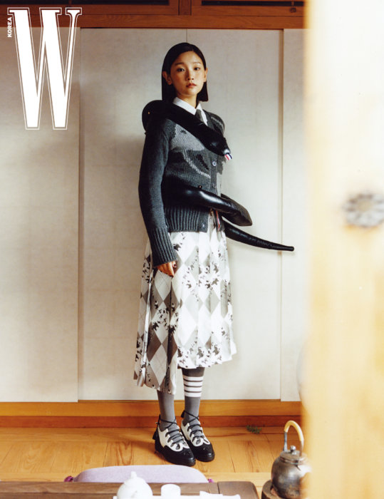 So Dam is wearing a patterned dark grey cardigan over a shirt and tie. With this she is wearing a medium length grey argyle skirt (£1,660). The super cute black and white “pebbled” brogues (£710) are paired with grey and white socks. To round the outfit off – both figuratively and literally – So Dam is wearing a wrap around snake bag. While it looks cool, I can’t quite see the logistics of it working out well 😂