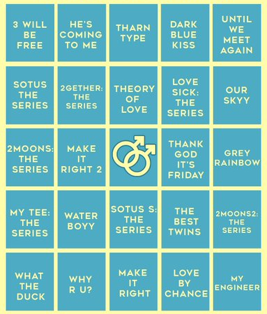 Still 2gether is a 5 episode mini series that was released in August/September as a sequel “one year later”. It’s not on the bingo board because it hadn’t come out yet, but I wanted to just quickly mention it here anyway. This was actually so good! I enjoyed the relationships and the conflicts were better thought out and seeing our mains having actually develop after supposedly dating for a year was nice to see. Tine was such a cutie in this and Sarawat remains the best boi. Also, the secondary characters/relationships were great (apart from Green and Dim, they were slightly annoying). I want a whole series on Man and Type – I love them so much! ♥ Also it was great to finally see Frank and Drake’s chemistry being utilised!