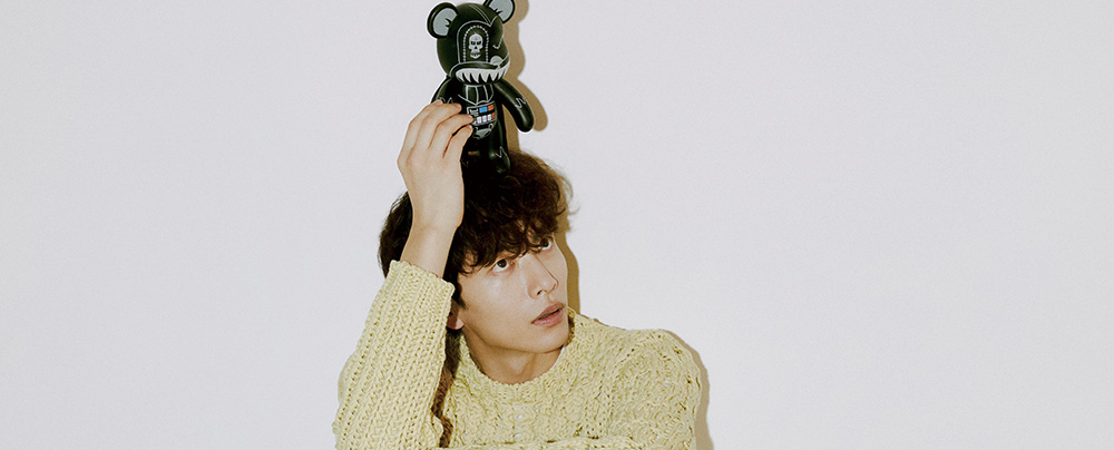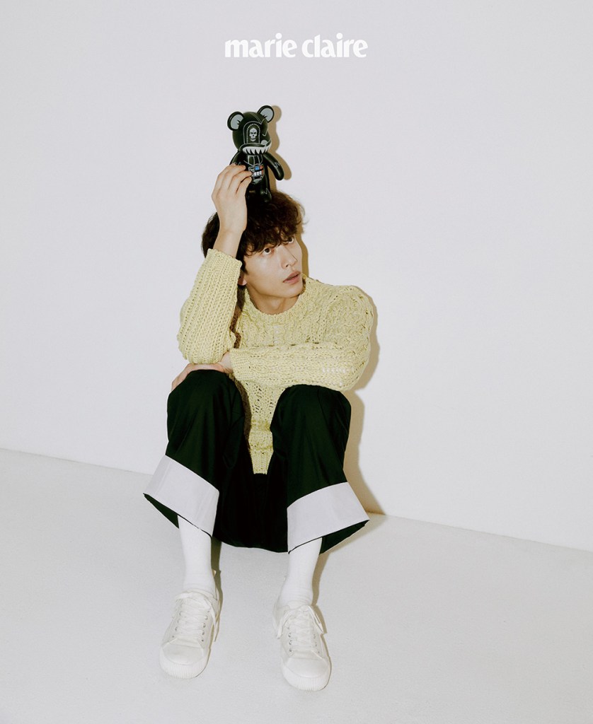 In the above picture and the three below, Lee Minki is wearing a yellow knit jumper (£655) and black trousers with white turn ups (£500) from Salvatore Ferragamo. I couldn’t find the reference for the trainers, so they may be from the stylist’s collection.