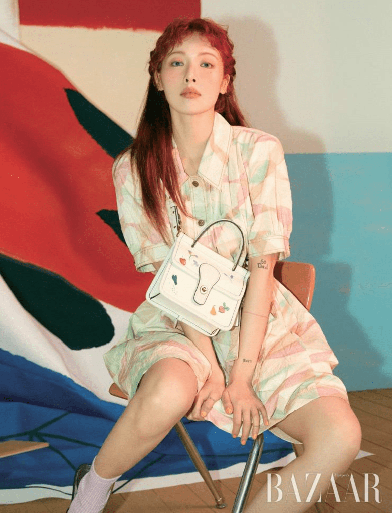 In this photo, Hyuna is holding the Swinger bag in Signature Jacquard (£275), the pink Swinger 20 bag (£295) and the 100% recycled Tote 30 (which by the way has a little raccoon on it! If only it didn’t cost £115).