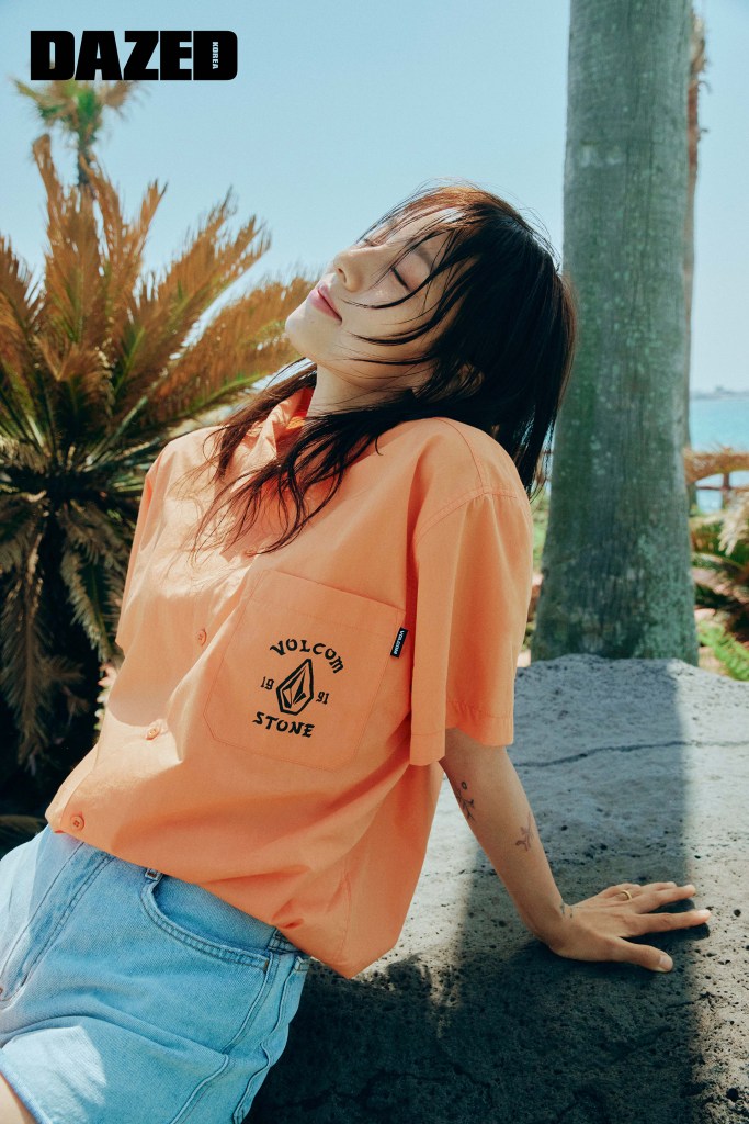 The peachy orange shirt is cute and suits Hyori’s skin tone really nicely. The high rise short make the outfit chic, yet laid back.