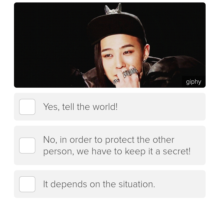This is a really hard one. I would want to be public, because you shouldn’t have to hide if you’re in a relationship. But, then I thought about this in the context of the Kpop world, so I went with It depends on the situation.