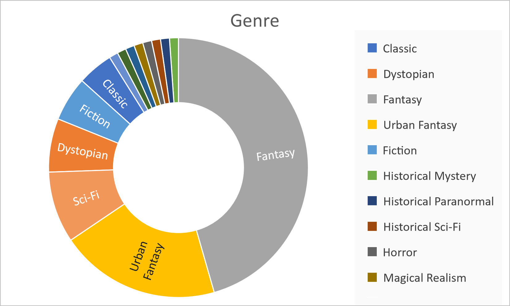 Fantasy: 41 || Urban Fantasy: 18 || Sci-Fi: 8 || Dystopian: 6 || Fiction: 5 || Classic: 4