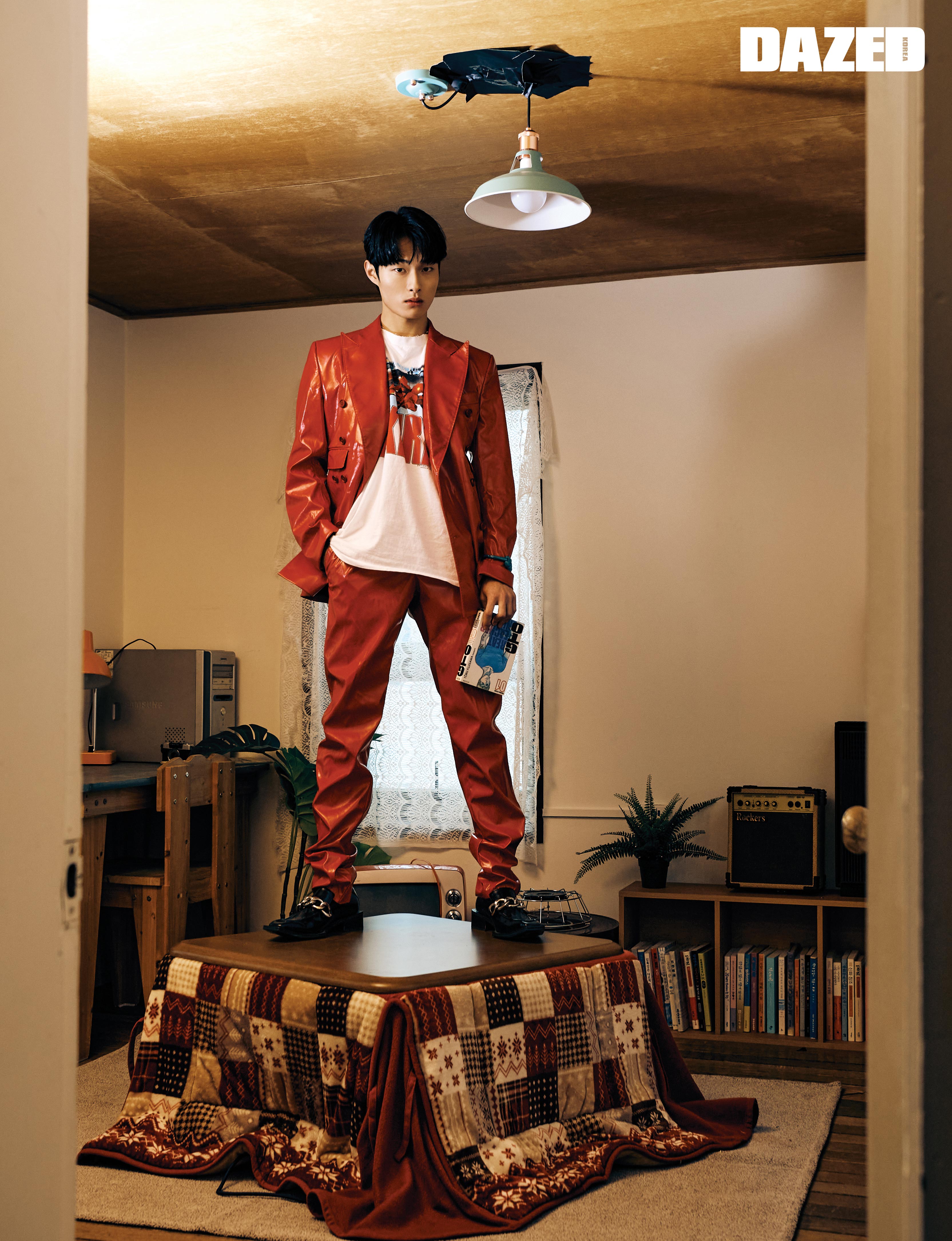 This looks like it could be an album cover for some obscure 80’s/90’s inspired band and I love that. The simple home setting is offset by Chan Young standing on top of the kotatsu in a vibrant red “laminated fabric” suit (Ā£2,350) from Dolce & Gabbana.