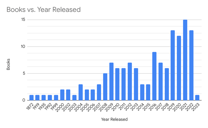This one is quite surprising! I thought I would still have loads from the mid 2010’s but I’m actually more up to date in my behind-ness 😂 I didn’t expect to have the most books from 2021.