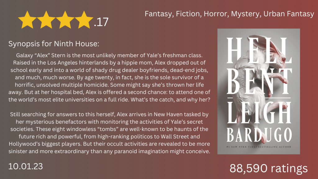 I think it will be a close call with Hell Bent, as Bardugo won this category with Ninth House (the 1st book in the series) when it came out in 2019. However, even though it is highly rated, the people I watch on YouTube have been disappointed by it.