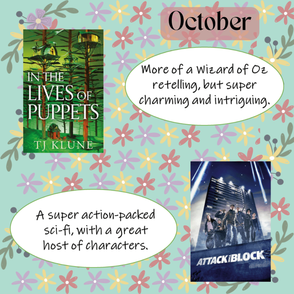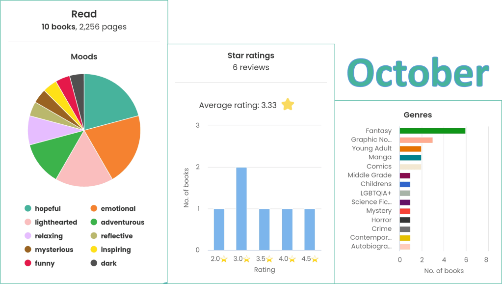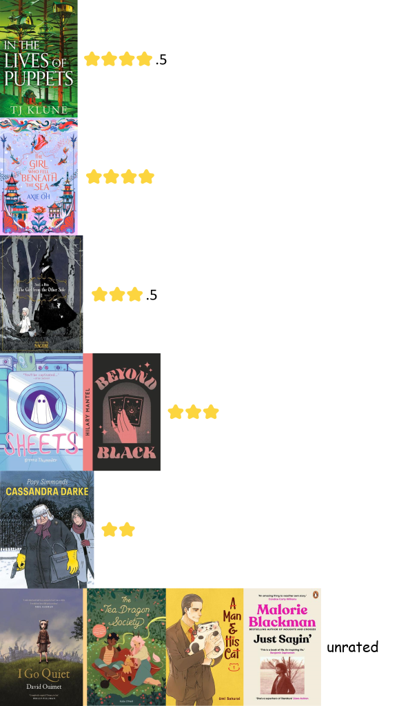 I read quite a few graphic novels in October through my library’s Libby app. For the most part they weren’t great, but I did enjoy some, such as “Sheets”; Brenna Thummler. Novel wise, I was happy to finally read “The Girl Who Fell Beneath the Sea”; Axie Oh, as it had been on my tbr for most of the year ♥