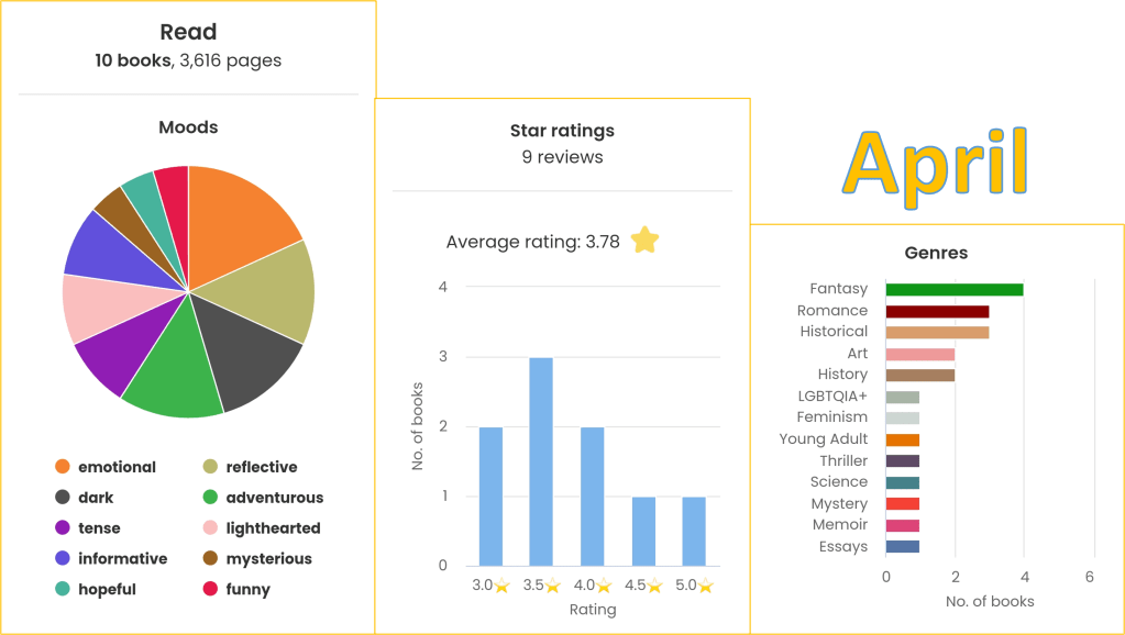 In April, my reading was a lot more rooted in the genres that I love. I also read a Skulduggery Pleasant book (written and published for Phase 2) that I didn’t hate *gasp*.