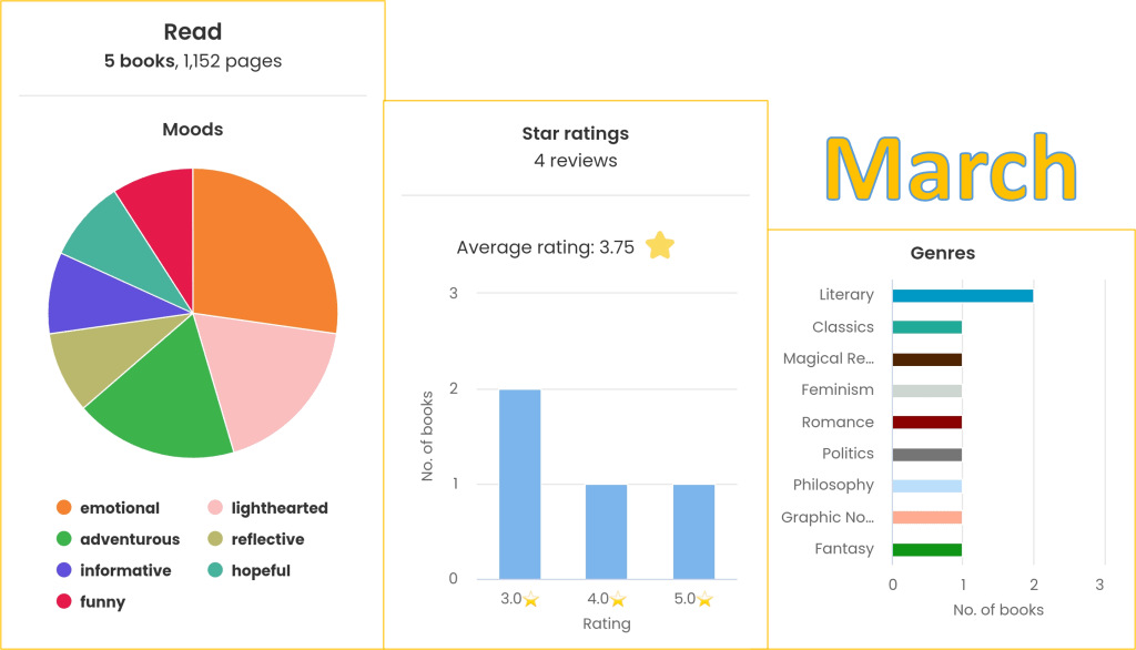 March was a pretty lacklustre reading month for me. I, of course, loved re-reading “Pride and Prejudice”. Jane Austen continues to have me in a chokehold with this novel.