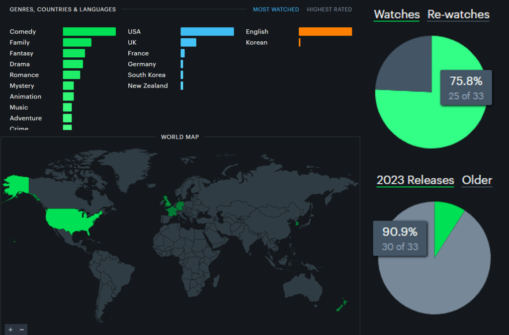 I only have stats for the films I watched in 2023, due to keeping track on Letterboxd. I’m going to look into ways to track series and data, but not sure what the best way to do that is. If you have any recommendations, they would be highly appreciated!