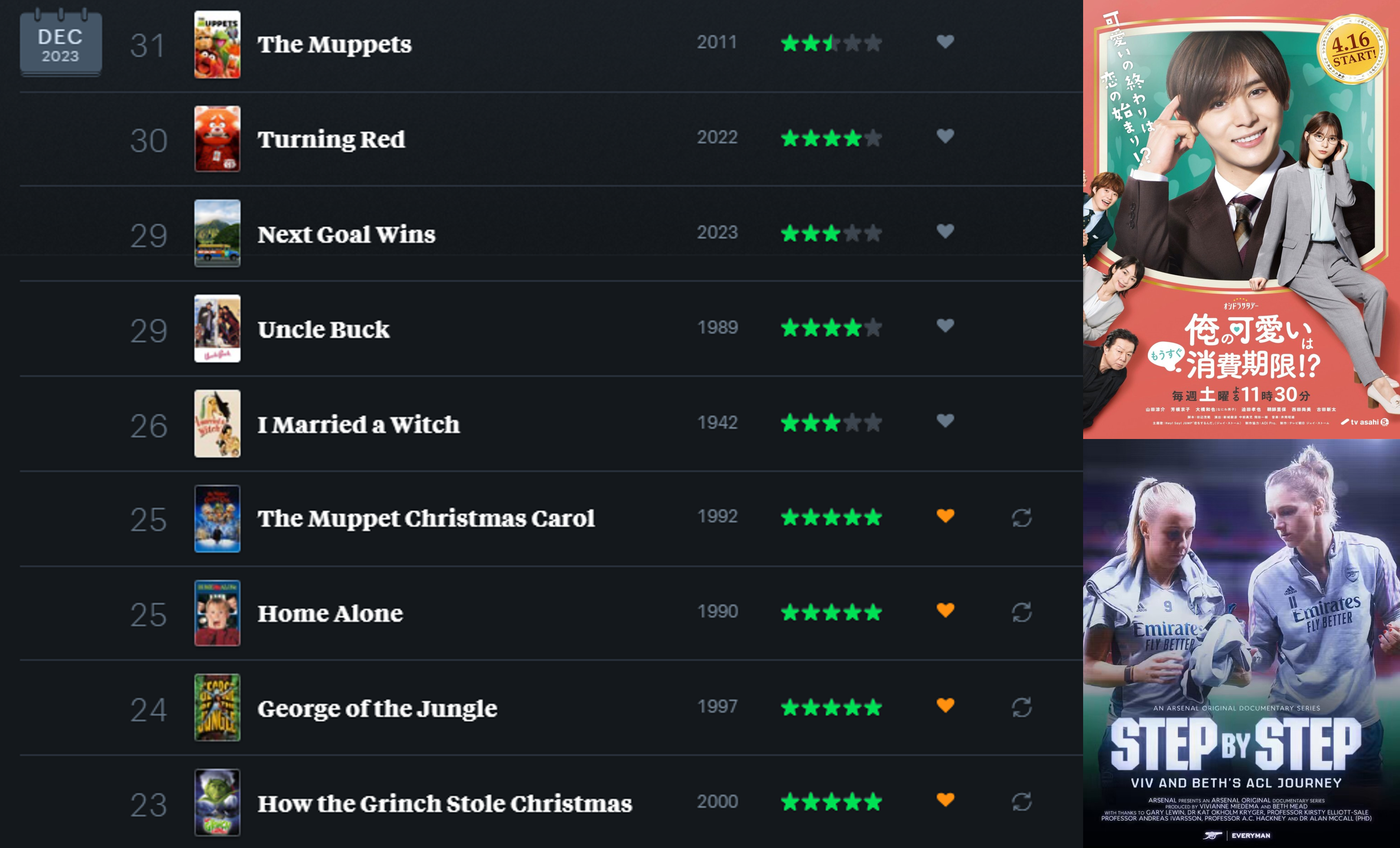 December is the month that I watched the most films and this was mostly because Christmas time is when I feel most motivated or even conditioned to watch films. I also watched Japanese drama “My Cuteness Is About to Expire!?” (2022) which I really enjoyed and gave 4⭐. I then watched the Arsenal documentary “Step by Step” (2023) which follows Beth Mead and Viv Miedema’s ACL journey. They talk a lot about the injury and how it needs to be looked into as women are far more likely to get this injury and it has increased significantly. I highly recommend watching it ♥