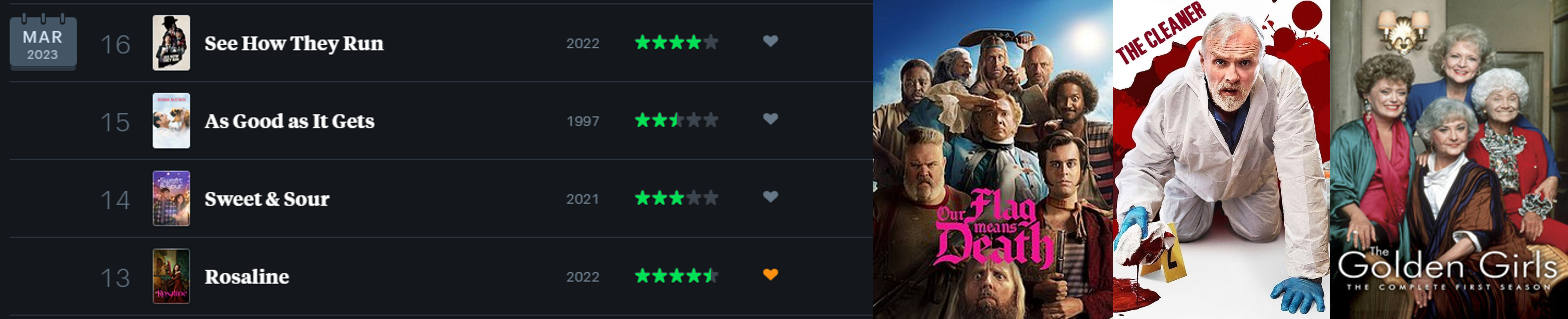 March saw me watch one of my highest rated films in “Rosaline” (2022). I started two new tv programmes and watched series two of “The Cleaner” (2023). I preferred series one of “The Cleaner”, but I still enjoyed this one as we saw more character development in Wicky.