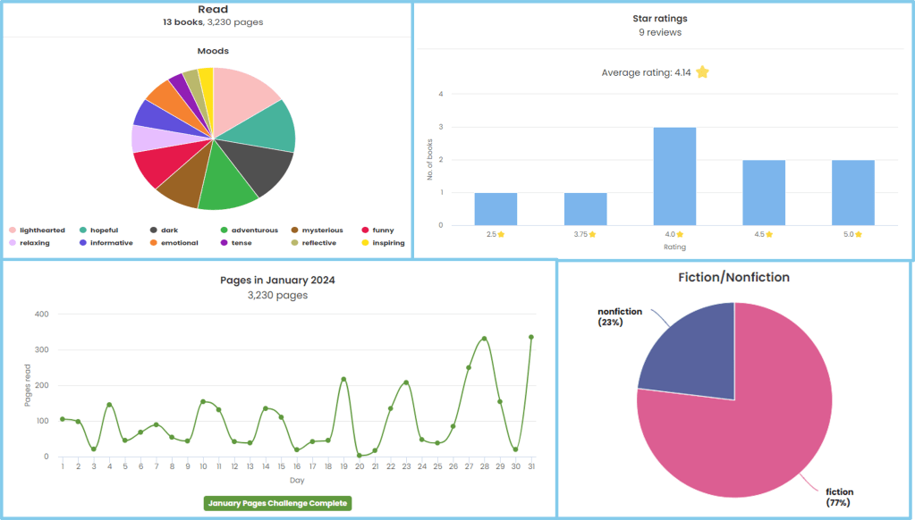 In January, I read 13 books and took part in the January Pages Challenge on StoryGraph. Due to this, I read 7 digital books, mostly from Libby (5 graphic novels; 1 poetry collection and 1 novella). These were easy reads just before bed each night if I was unable to read anything during the day due to work.