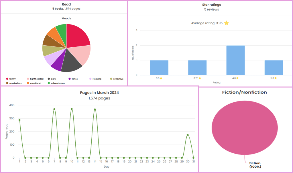 March was a slower month with my reading as work was pretty stressful and I just found myself being too tired to read.