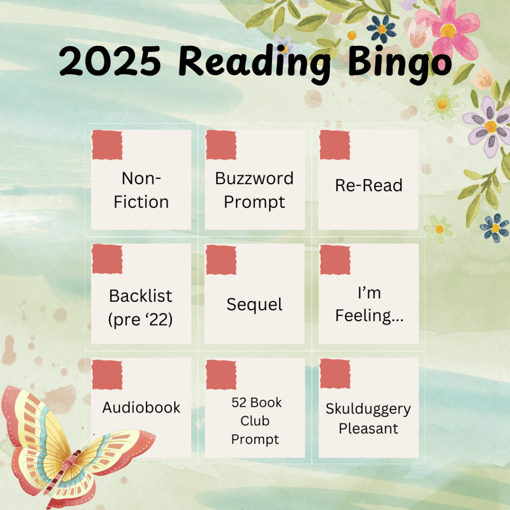 The last square is probably the one I’m scared of the most. Derek Landy has had me in a chokehold since I was 12 years old and I don’t know how to escape. I hate Phase 2 of Skulduggery Pleasant and I don’t use ‘hate’ lightly. I can’t stand it. My plan in 2025 for Skulduggery Pleasant is to finish Phase 2 and catch up with these new ones before re-reading Phase 1. I swear to all that is holy, if Phase 2 has ruined my enjoyment of Phase 1, I’m coming for Derek!