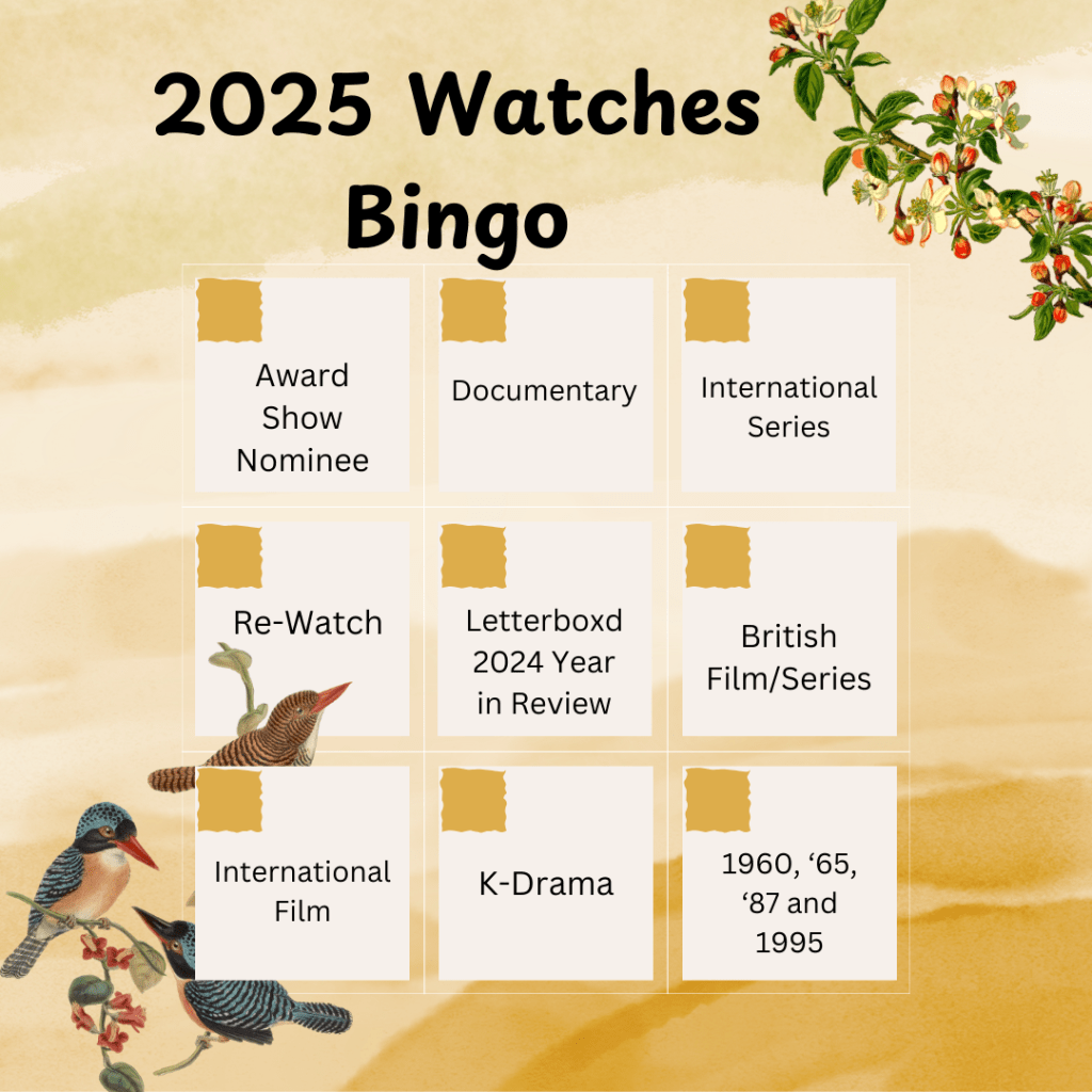 The first row has ‘Award Show Nominee’, ‘Documentary’ and ‘International Series’. For the award show, this includes winners as they technically were also nominees, from any year. I’m not restricting myself to 2024/25 as these are sometimes harder/expensive to consume. I want to watch more documentaries this year, especially as I have created my own rating system that I’m looking forward to using. The last one is to catch the other tv series that I watch that aren’t Korean.