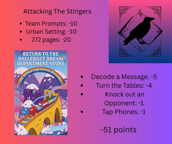 The Ravens used this book to attack the Stingers. It met one of the team prompts (-10): ‘a book with a character hiding a secret’.