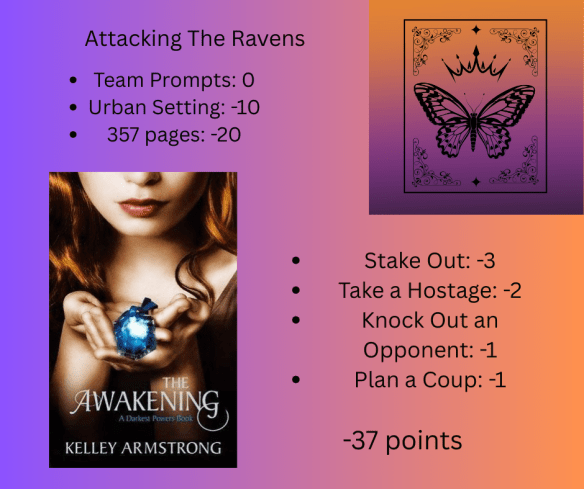 Again, I was only able to get four prompts for The Reckoning. It got attack points for having a two word title (-3); having a violent word in the title (-2); for having characters with a criminal background (-2) and for being a book I own physically (-1).