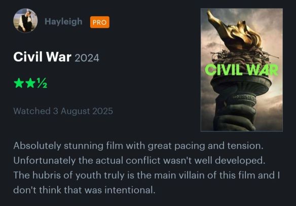 We follow three journalists and an amateur as they travel across the United States to make their way to the capital before the President is killed. The civil war itself is in full swing, I don’t understand why the synopsis uses ‘brink’… However, going through the film, the reasons for the civil war and the ‘sides’ are underdeveloped.
